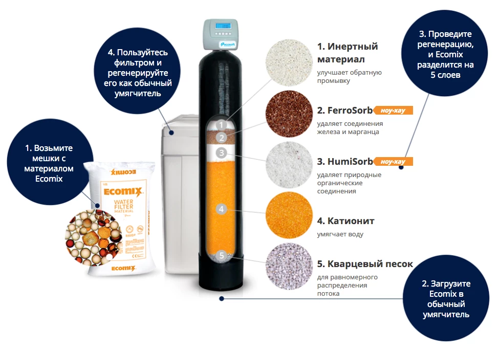Склад включає кілька функціональних компонентів: катіоніт для пом’якшення води, сорбенти FerroSorb і HumiSorb для видалення заліза, марганцю та органіки, інертний матеріал для оптимізації процесу промивання та кварцовий пісок для рівномірного розподілу потоку. Після першої регенерації суміш розділяється на шари відповідно до щільності, що забезпечує стабільну ефективність очищення.