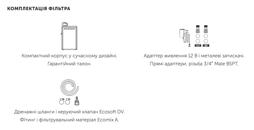 Усі елементи фільтра зібрані в одному компактному корпусі з керуючим клапаном. Дренажно-розподільча система закрита захисною кришкою. Усередині корпусу розміщено балон із фільтрувальним матеріалом, а також відсік для зберігання таблетованої солі та приготування сольового розчину. У верхній частині встановлений електромеханічний керуючий клапан із дисплеєм, який автоматично контролює всі етапи роботи фільтра. Керуючий клапан Ecosoft DV українського виробництва стійкий до механічних домішок.