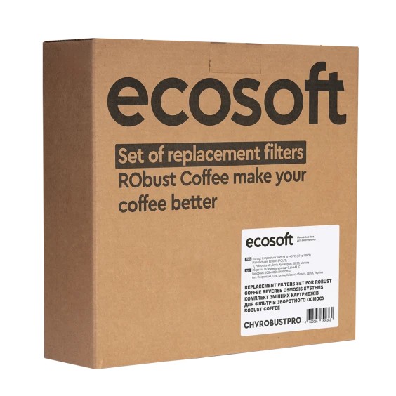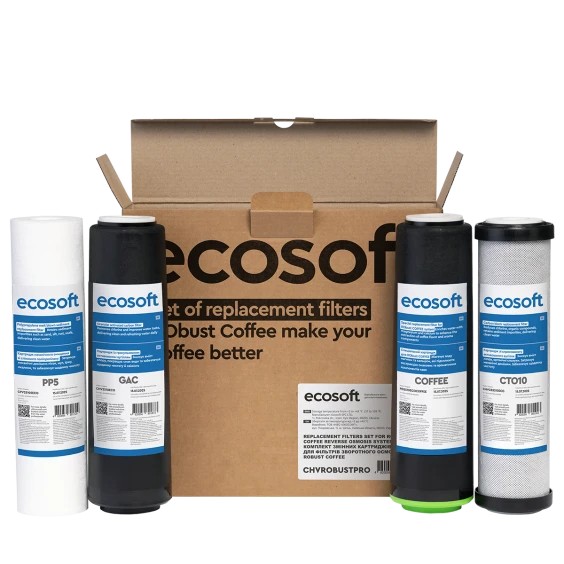 Комплект картриджів Ecosoft 1-2-3-4 CHVROBUSTCOFFEE призначений для сервісного обслуговування системи зворотного осмосу RObust COFFEE. Набір забезпечує попереднє очищення та підготовку води перед мембранним етапом фільтрації, а також формує оптимальний мінеральний склад води для приготування кави.