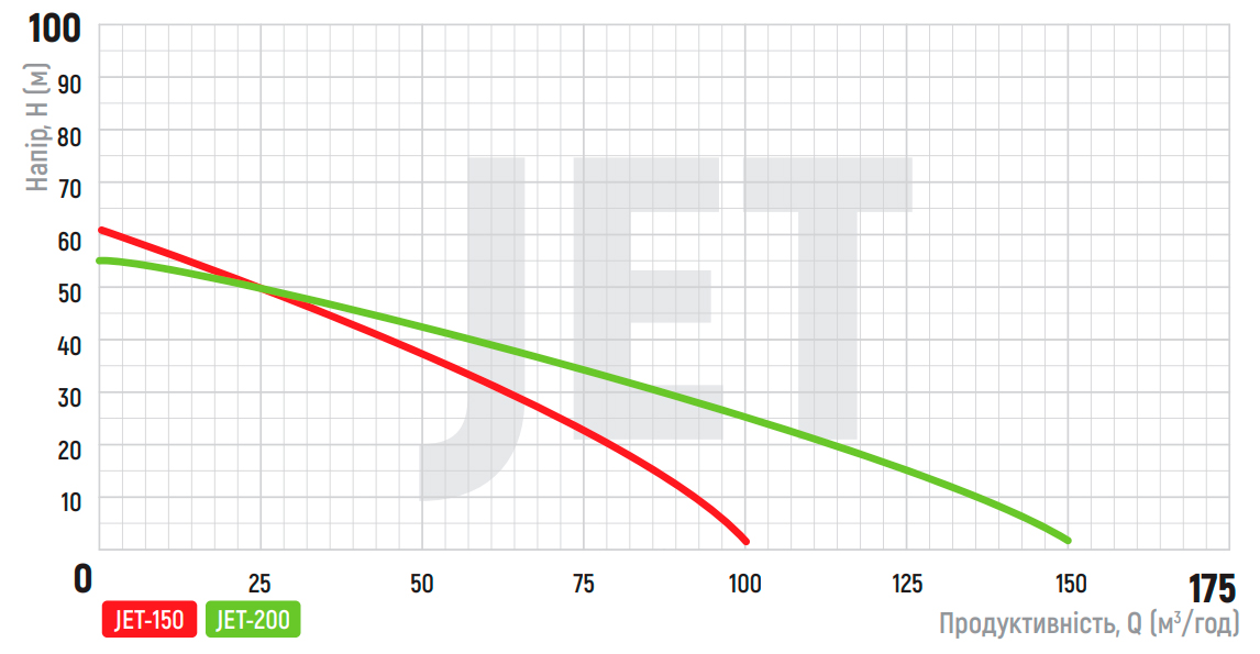 Насос оснащений відцентровим однофазним двигуном потужністю 1,5 кВт, що забезпечує максимальну продуктивність до 150 л/хв (≈ 9 м³/год) та максимальний напір до 55 м, достатній для подачі води у приватний будинок або систему поливу. Корпус насоса виготовлений з чавуну з антикорозійним покриттям, робоче колесо — латунне, вал двигуна — із нержавіючої сталі AISI 304; обмотки статора — мідні. Коер JET-200 має глибину всмоктування до 9 м, розрахований на подачу тільки чистої води без грубих механічних домішок.