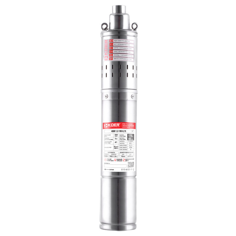 KOER 4QGD 1.2‑100‑0.75 — занурювальний свердловинний шнековий насос для подачі чистої прісної води зі свердловин, колодязів або резервуарів у побутових і господарських системах водопостачання. Підходить для приватних будинків, дач, невеликих господарств та поливу ділянок.