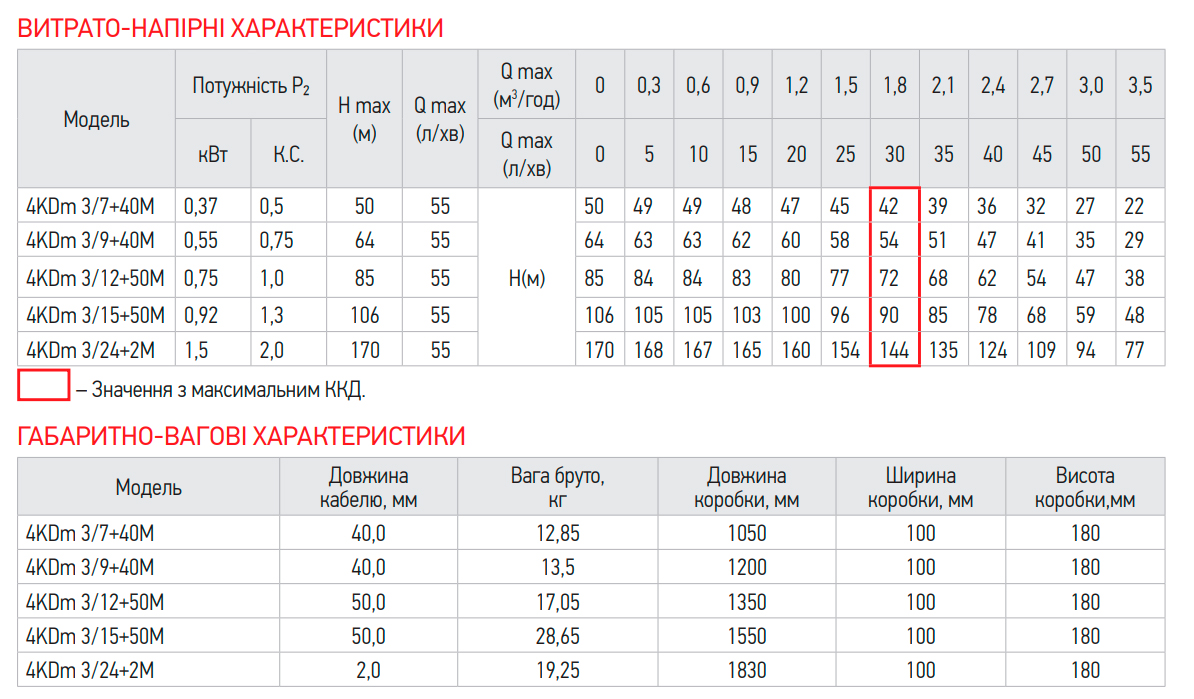 KOER 4KDm 3/24+2М (KP2877) — занурювальний свердловинний насос для перекачування чистої прісної води в побутових і господарських системах водопостачання. Призначений для подачі води з колодязів, свердловин чи резервуарів до трубопроводів, автоматичних насосних станцій або систем поливу.