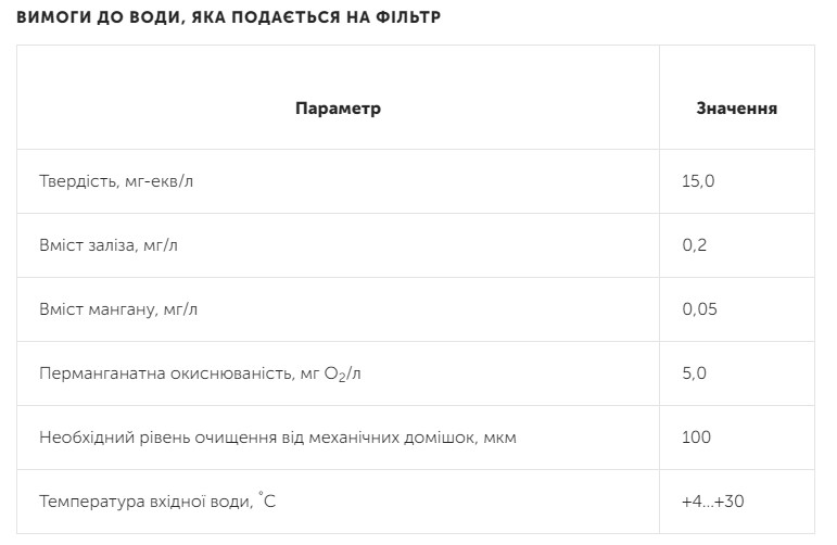 Рабочая производительность установки составляет 2,0 м3/ч, максимальная – до 2,5 м3/ч. Между регенерациями система способна обработать до 7,4 м3 воды в зависимости от начальной жесткости. На одну регенерацию уходит 3,7–5 кг таблетированной соли и около 370 литров воды. Фильтр работает при давлении от 2 до 6 бар, подключается к дюймовому трубопроводу и потребляет всего около 30 Вт от сети 230 В. Перепад давления в рабочем режиме – 0,5–1 бар. Для стабильной работы рекомендуется предварительная механическая очистка входной воды.