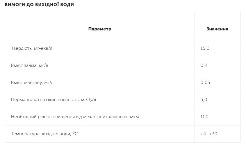 Система рассчитана на рабочее давление от 2 до 6 бар, перепад давления в процессе работы не превышает 0,5-1 бар. Подключение к трубопроводу осуществляется через резьбовое соединение диаметром 1 дюйм, питание от стандартной сети 220–230 В / 50 Гц при потребляемой мощности всего 30 Вт. Габариты установки составляют 150 на 50 на 190 см, вес – 200 кг. Для максимальной эффективности и долговечности смолы рекомендуется установка системы после предварительного механического фильтра.