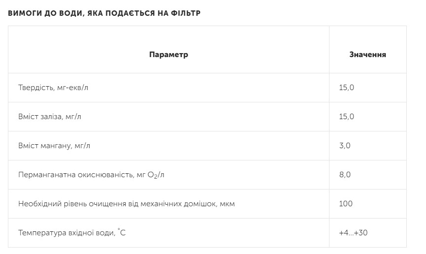 Сердцем фильтра является фильтрующий материал Ecomix A, расположенный в крепком корпусе. Система также снабжена солевым баком для регенерации и многофункциональным управляющим клапаном от Clack Corporation (США). Именно этот клапан отвечает за полностью автоматическую и бесшумную работу оборудования, сводя участие пользователя к минимуму — достаточно периодически добавлять таблетированную соль в бак.