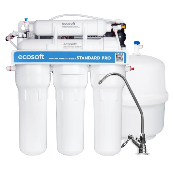 Фильтр обратного осмоса Ecosoft Standard PRO 5-50P MO550MPECOSTD – бытовая система очистки воды с повышающей помпой, предназначенная для работы в условиях нестабильного или пониженного давления в водопроводе. Модель реализует пятиступенчатую схему фильтрации с использованием мембраны обратного осмоса и минерализатора.