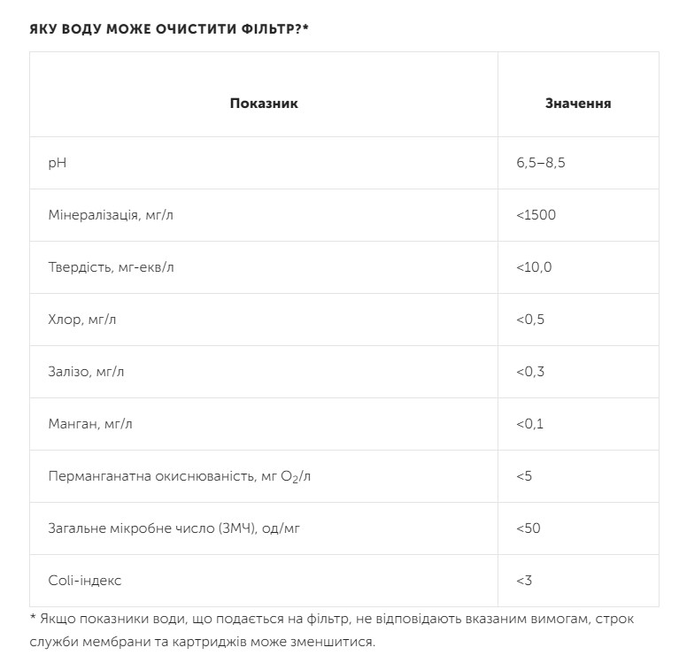 Модель ориентирована на использование с водой централизованного водоснабжения с минерализацией до 1500 мг/л и подходит для питьевой воды домохозяйств из нескольких человек.