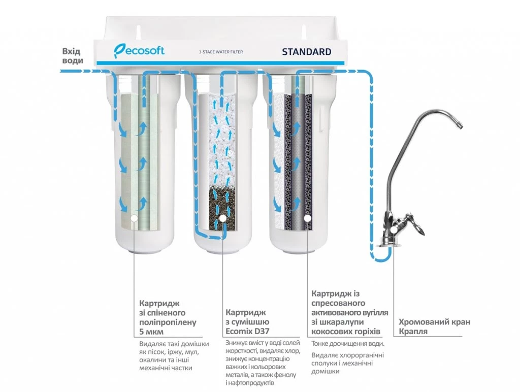 Система реализует трехступенчатую схему фильтрации. Первый картридж из полипропилена задерживает механические примеси, в том числе песок, ржавчину и другие взвешенные частицы. Вторая степень содержит многокомпонентную загрузку типа Ecomix, которая снижает жесткость воды, удаляет хлор, органические соединения, фенолы, нефтепродукты и частично ионы тяжелых металлов. Третий этап выполняет доочистку и улучшает органолептические характеристики воды.