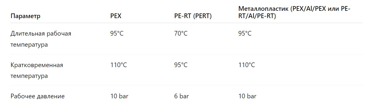 6. Долговечность. PEX, PERT, металлопластик имеют срок службы 25–50 лет при правильной эксплуатации. Для теплого пола, который укладывается под стяжку, это важно, потому что демонтаж очень сложен.