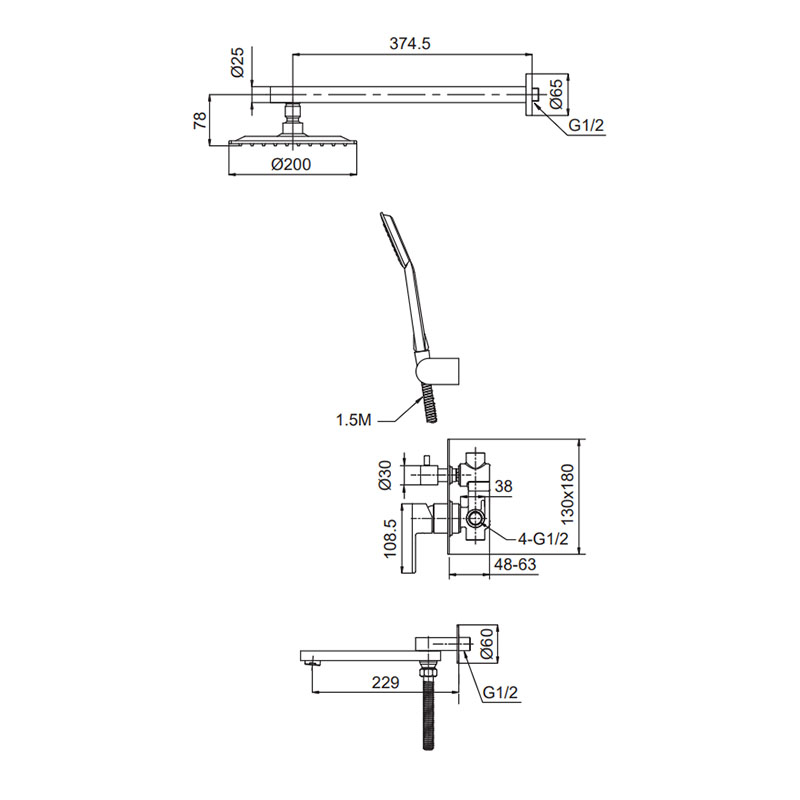 Шланг, ручная лейка, потолочная лейка, держатель для лейки